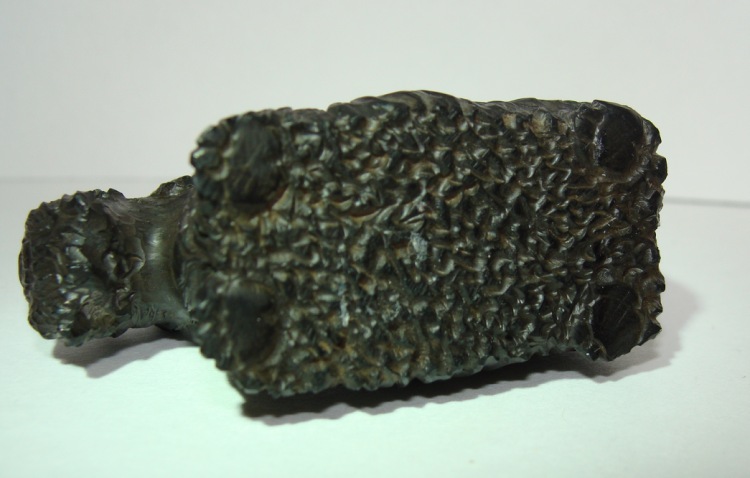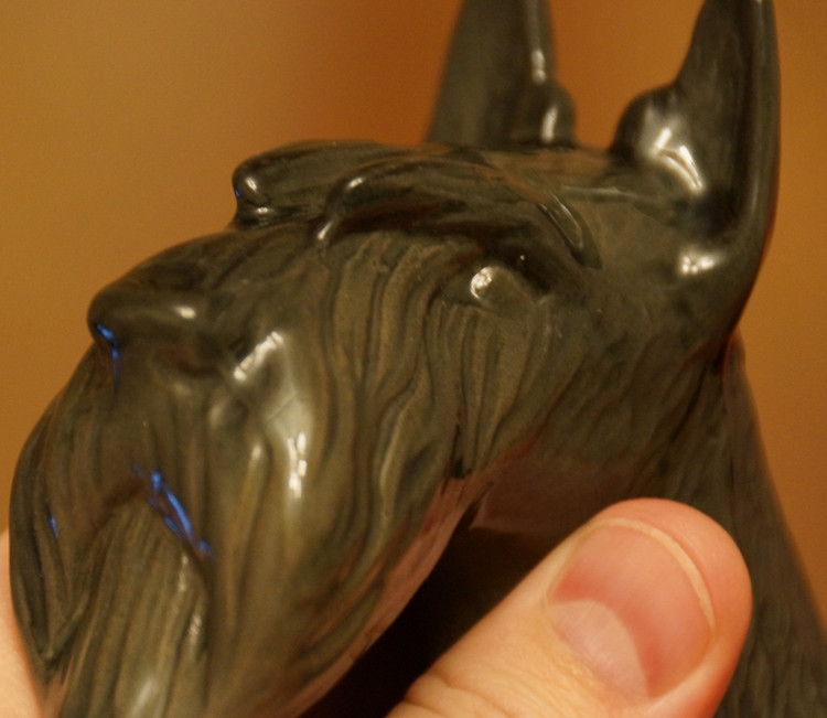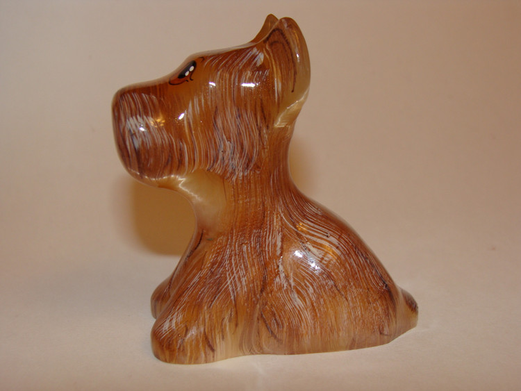 Выполнено ...(Игорь Денегин, Воронеж) .... Автор биолог, увлекается резьбой по кости, редким породам камней. В фигурке соблюдены все пропорции и особенности породы. Отображены мельчайшие подробности - вплоть до пальчиков на лапах, ануса и шерсти на пузике...)))) Гагат (от греч.чёрный янтарь), также известен как черная яшма или гишер — разновидность каменного угля (из группы «бурых углей»). Однородный, плотный, вязкий, с ярким смолистым блеском материал. Цвет камня чёрный или коричнево-чёрный. Образование его связывают с метаморфизмом древесины, погребённой в морских илах мезозойских и кайнозойских отложений. Встречается в виде отдельных скоплений, кусков и т. п. в песчаниках, мергелях, а также в пластах слабометаморфизованных каменных и бурых углей. Гагат легко обрабатывается, хорошо полируется, приобретая красивый блеск. (100...)