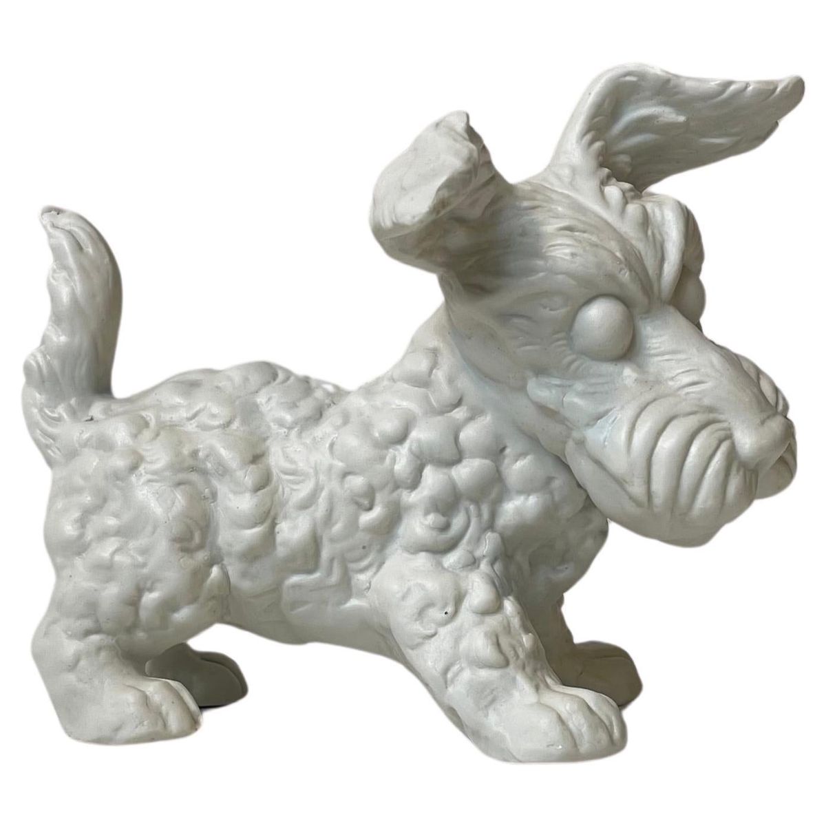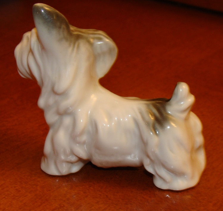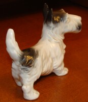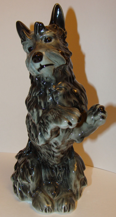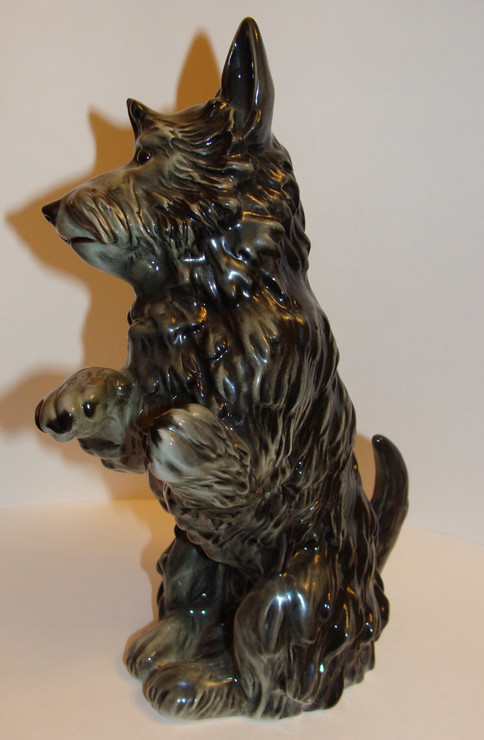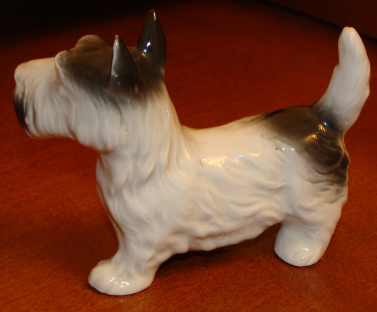 Фарфоровая фигура терьера, сидящего на задних лапах, выполнена на фабрике Karl Ens. Эта семейная фабрика была основана в Тюрингии Карлом Энсом в середине 19 века и с успехом производила элитный декоративный фарфор под управлением потомков своего основателя более ста лет, пока не была национализирована в 1959 году, продолжив существовать под государственным управлением. Среди разнообразных моделей фабрики особым успехом пользуются фигуры животных и птиц, большинство из которых было создано в довоенное время. Фигура скотч терьера выполнена живо и реалистично. Живая пластика тела, жёсткая чёрная шерсть, блестящие глаза и треугольные ушки - пёс, будто настоящий, застыл, сидя на задних лапах в ожидании угощения. Полагаю, судя по зеленой подглазурной марке, что это производство после 1990 г. Мануфактура "Porzellanfabrik Karl Ens" была основана в 1890 году и существовала вплоть до 1972 года. В 1959 основным акционером фабрики было правительство ФРГ, а в 1972 фабрика была национализирована и именовалась "VEB Unterglasurporzellanfabrik" ( 1972-1974), позже "Betriebsteil 1 des VEB Sitzendorfer Porzellanmanufaktur" (1974-1990). Своими успехами тюрингские мануфактуры во многом обязаны творческим исканиям и достижениям мастеров разных специальностей, часто остававшихся безымянными, которые в значительной мере вдохновлялись местными художественными традициями. Многое из того, что создано на тюрингских мануфактурах, по своему художественному значению не уступает произведениям ведущих мануфактур Германии. Мануфактура выпускала различные фигурки, подарочные статуэтки и другие декоративные фарфоровые изделия. На фото-марочнике 2-ая марка в зеленом цвете опять использовалась с 1990 года.
