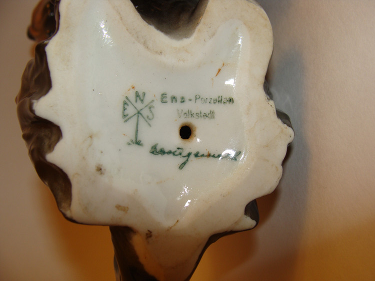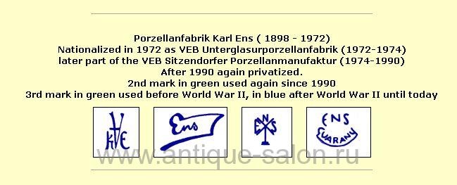 Фабрики Фолькштедта, бесспорно, сыграли ключевую роль в развитии фарфоровой индустрии Тюрингии. Честь основания первой мануфактуры по производству фарфора в Тюрингии принадлежит троим людям: Георгу Генриху Махеляйду (1723-1801 гг), князю Шварцбурга-Рудольштадта Иоганну Фридриху фон Шварцбург-Рудольштадт (1721-1767 гг) и Августу Фридриху Норту (1733-1798 гг). Сырье на фабрику поставлялось из самого княжества: песок с территорий Кёнигзее и Рудольштадта; капсельтон (особый вид глины) - с территории Кобурга, фарфорный грунт - из Геберсдорфа возле Грэфенталя. Производством фарфорной массы и глазуря занимались дочерние фабрики в Зитцендорфе, Кёнигзее и Шаала. Фабрика Фолькштедта производила необычайно широкий ассортимент продукции: сервизы для кофе, чая и горячего шоколада, подсвечники, вазы, огромные декорированные блюда, умывальные раковины, кружки, масленки, пуговицы, приклады ружей и эфесы рапир, медали и знаменитые статуэтки. В 1832 г. фабрика Фолькштедта отказалась от привилегии. Это стало началом основания других фарфоровых производств на территории княжества Шварцбург-Рудольштадт и, конечно же, Фолькштедта. В 1861 г. владельцами Фолькштедтской фабрики стали Карл Энс-старший из Лауша и Трибнер из Ваймара. Они руководили компанией под именем Трибнер, Энс и компания (Triebner, Ens & Co). Все больше и больше предметов их производства вызывали восхищение. Одной из причин тому стало сотрудничество с двумя молодыми дизайнерами по фарфору - Эдуардом Энсом и его братом Карлом Энсом-младшим. В 1899 г. Карл Энс-младший покинул компанию вместе со своими сыновьями и основал новую фирму - фарфоровую фабрику Карла Энса. Первая Фоллькштедтская фабрика теперь называлась Старейшей Фолькштедтской фарфоровой фабрикой. В 1937 г. она слилась с фабрикой Унтервайсбаха и получила название Старейшей Фолькштедтской фарфоровой фабрики AG (Aelteste Volkstedter Porzellanfabrik AG). Некоторыми другими фарфоровыми фабриками Фолькштедта были: Ричард Экер & компания; Байер & Бод (1890 г.), Шэфер & Отец (1890 г.); Мюллер & компания; Акерманн & Фриц (1908 г.). Все они выпускали широкий ассортимент продукции: от бытовых изделий из фарфора до самых роскошных фарфоровых статуэток. На фото-марочнике 3-я марка использовалась в зеленом цвете до Второй мировой войны, а в голубом цвете после Второй мировой войны. Здесь марка зеленого цвета, значит скотчик довоенный!!!